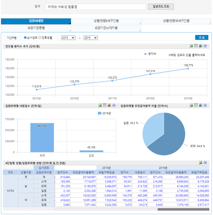 건강보험심사평가원 통계에 따르면 어깨의 석회성 힘줄염 환자 수는 지속적으로 증가하고 있다. 2019년에는 약 16만 명으로 5년 전인 2015년(11만 명)에 비해 42.6% 증가했다. 성별로는 여성이 남성에 비해 약 2배 많았고, 특히 50대와 60대 여성이 전체의 41.3.%를 차지했다. 어깨의 석화성 힘줄염(건염)은 힘줄(건) 조직에 석회(칼슘)가 침착되고, 이로 인해 통증이 생기는 질환이다. 간혹 힘줄에 석회가 침착되어 있어도 증상이 없는 경우도 있다. 정확한 원인은 알 수 없으나, 일반적으로 회전근개 힘줄의 퇴행성 변화나 혈액순환 부족이 원인으로 알려져 있다.