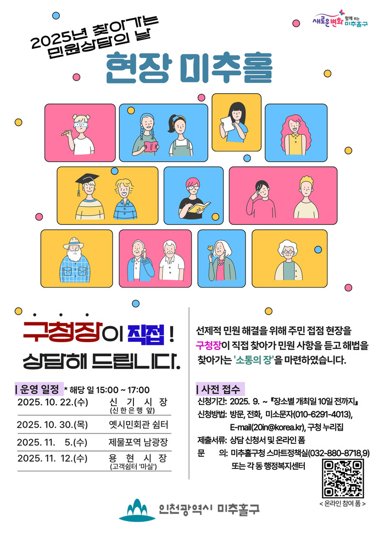 민원 상담은 방문 또는 구청 누리집, ‘미소 문자 창구’ (010-6291-4013), 전자우편(20in@korea.kr) 등을 통해 신청할 수 있으며, 가까운 동 행정복지센터에서도 민원 접수 창구가 운영될 예정이다.