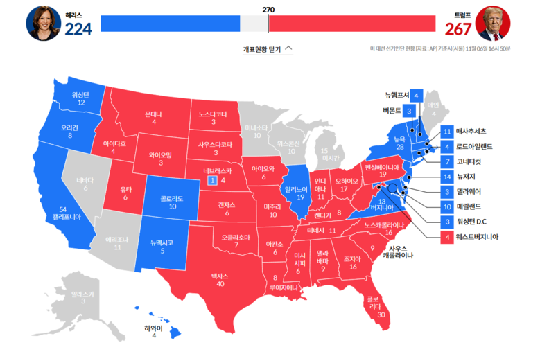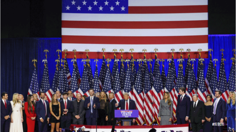 [세계타임즈 = 김민준 기자] 미국 공화당 대통령 후보 도널드 트럼프 전 대통령이 11·5 미국 대통령 선거 승리를 선언했다.트럼프 전 대통령은 미 동부시간으로 대선 다음날인 6일 오전 2시30분께 자택이 있는 플로리다 팜비치 컨벤션센터에 집결한 지지자들 앞에서 연설을 통해 여러분의 제45대, 그리고 제47대 대통령으로 당선되는 영광을 누리게 해준 미국민에 감사하고 싶다고 말했다.우리는 우리나라가 치유되도록 도울 것이라며 우리는 국경을 고칠 것이며 우리나라에 대한 모든 것을 고칠 것이라고 밝혔다.오늘 밤 우리가 역사를 만든 이유가 있다"며 나는 여러분과 여러분의 가족, 여러분의 미래를 위해 싸우겠다고 말했다.트럼프 전 대통령은 이는 미국 국민을 위한 장대한 승리이며 미국을 다시 위대하게 만들 수 있게 해줄 것이라고 했다.난 우리 자녀와 여러분이 가질 자격이 있는 강력하고 안전하며 번영하는 미국을 만들 때까지 쉬지 않을 것이다. 미국의 진정한 황금기가 도래할 것이라고 선언했다.이번 선거를 통해 공화당이 다시 상원 다수당이 됐고, 하원 다수당 지위도 유지할 것으로 보인다면서 미국은 우리에게 전례없고 강력한 권한을 줬다며 행정부에 이어 의회 권력도 차지했다고 밝혔다.나는 간단한 좌우명으로 통치하겠다. 그건 약속한 것은 지킨다는 것이라며 우리는 미국을 다시 안전하고 강하고 번영하고 자유롭게 만들 것이며 무엇도 내가 여러분 국민에게 한 약속을 지키는 것을 막지 못할 것이라고 강조했다.이제는 지난 4년간의 분열을 뒤로 하고 단결할 시간이라면서 성공이 우리를 단결시킬 것이며 우리는 모두 미국을 우선하는 방식으로 시작할 것이다. 우리는 적어도 당분간은 우리나라를 가장 우선해야 한다고 말했다.우리는 튼튼하고 강력한 군대를 원하고, 이상적으로는 군대를 사용하지 않아도 될 것이라며 그들은 내가 전쟁을 시작할 것이라고 했지만 나는 전쟁을 시작하지 않고 전쟁을 끝낼 것이라고 주장하기도 했다.캠프 공동선거대책위원장인 수지 와일스와 크리스 라시비타를 비롯해 당선을 도운 이들을 거명하며 감사를 표했다.특히 그는 일론 머스크 테슬라 최고경영자(CEO)에 대해 우리에게 새로운 스타가 있다. 일론이라는 스타가 탄생했다. 그는 대단한 사람이다라고 말했다.무소속으로 출마했다가 자신을 지지한 로버트 F. 케네디 주니어를 거명하고서 그는 미국을 다시 건강하게 만들도록 도울 것이라고 밝혔다.AP 통신에 따르면 이날 오전 2시40분 기준으로 트럼프 전 대통령은 대선 승리 요건인 전체 선거인단 538명 중 과반인 270명에는 3명 모자라는 267명의 선거인단을 확보했다.트럼프 전 대통령의 이날 승리 선언은 경합주 가운데 조지아와 노스캐롤라이나 외에도 최대 승부처였던 펜실베이니아를 이기면서 사실상 승리를 거머쥐었다는 판단에 따른 것으로 보인다.트럼프 전 대통령은 연설에서 모든 주에서 개표가 완료됐을 때 자신이 확보할 선거인단 수를 최소 315명으로 예상했다.이날 트럼프 전 대통령의 연설 무대에는 부인 멜라니아 여사를 비롯한 가족, 부통령 후보인 J.D. 밴스 상원의원 부부, 캠프 참모들이 함께 올라 지지자들에게 인사했다.