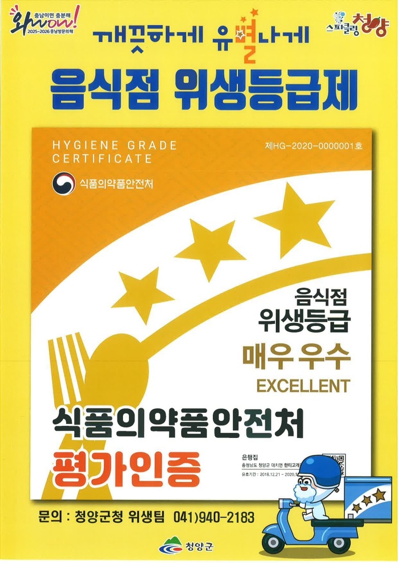 위생등급제 신청은 식품안전나라 온라인 접수(foodsafetykorea.go.kr) 또는 청양군청 행복민원과 위생팀 방문 접수로 가능하다. 자세한 문의는 041-940-2184로 하면 된다.