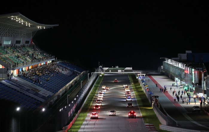 [사진설명] 지난해 인제 스피디움에서 열렸던 CJ대한통운 슈퍼레이스 챔피언십 ‘나이트 레이스’ 캐딜락 6000 클래스 결승전에서 머신들이 포메이션랩을 시작하기 위해 그리드에 정렬해 있다.
