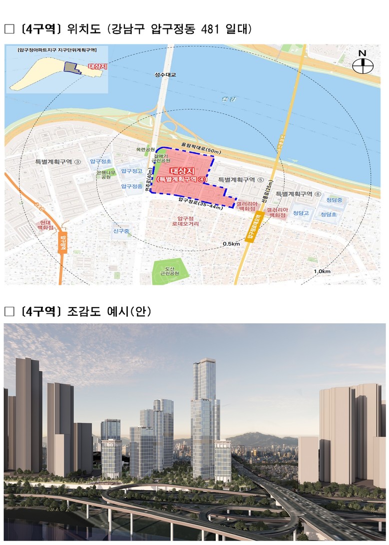 압구정4구역은 준공 후 약 44년이 경과된 노후 아파트를 재건축하는 사업지로, 서울시는 용적률 300% 이하, 9개동 1,664세대(공공주택 193세대 포함), 최고 높이 250m 규모로 한강변의 매력적인 수변 주거문화를 선도하는 공동주택단지를 공급할 계획이다.