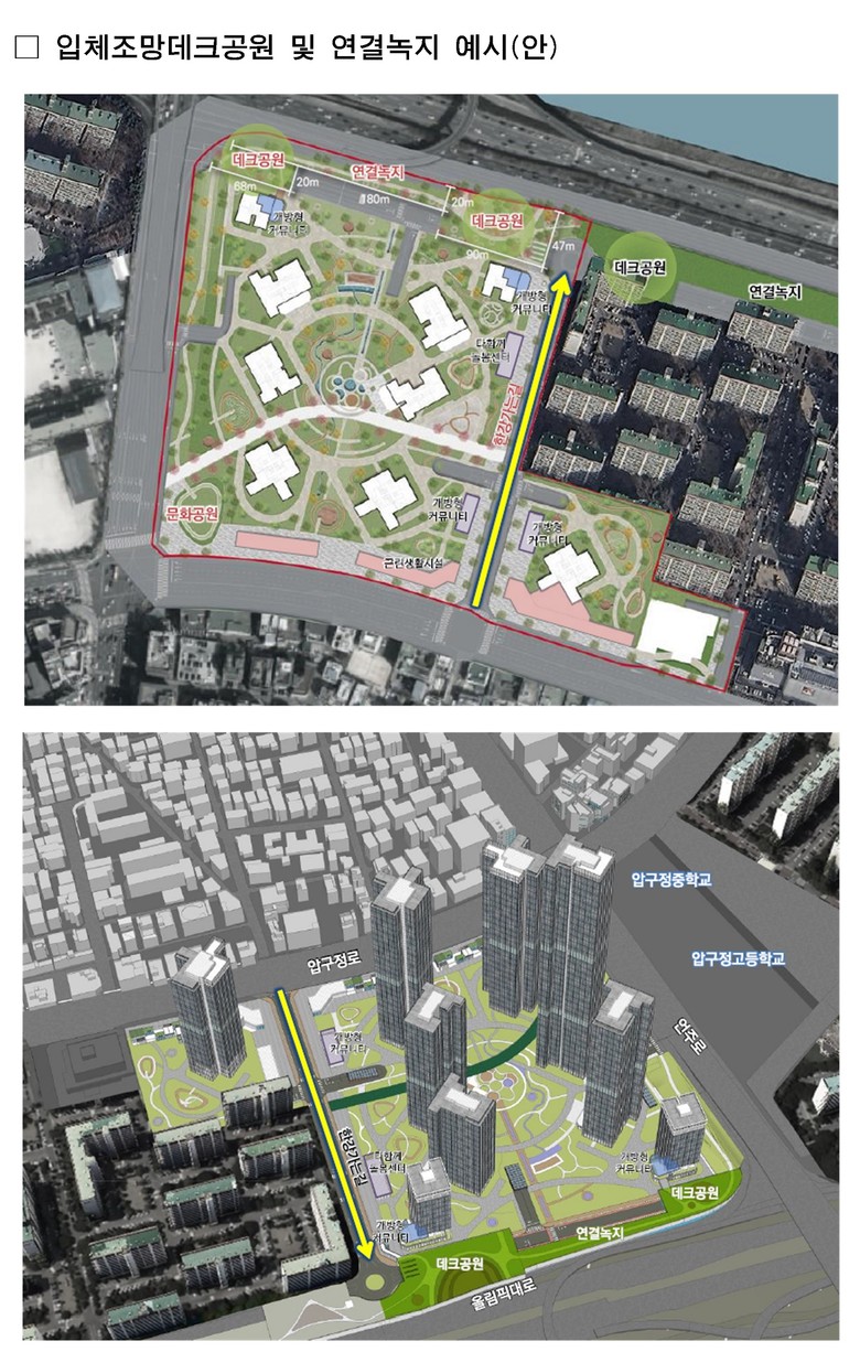 특히, 압구정 4구역은 좁은 한강 둔치 폭으로 한강 연결 입체보행교는 설치하지 않지만, 구역 북측에 한강 조망이 가능한 입체조망데크공원을 4구역에서 5구역까지 연결해 누구나 쉽게 접근해 한강 조망을 즐길 수 있도록 계획했다.