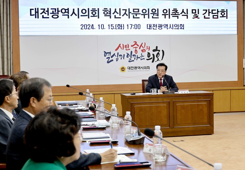 [대전 세계타임즈=이채봉 기자] 대전시의회는 15일 시의회 소통실에서 대전광역시의회 혁신자문위원 위촉식 및 간담회를 갖고, 대전시의회의 역사 이래 최초로 의장 직속 ‘대전광역시의회 혁신자문위원회’의 공식 출범을 알렸다.