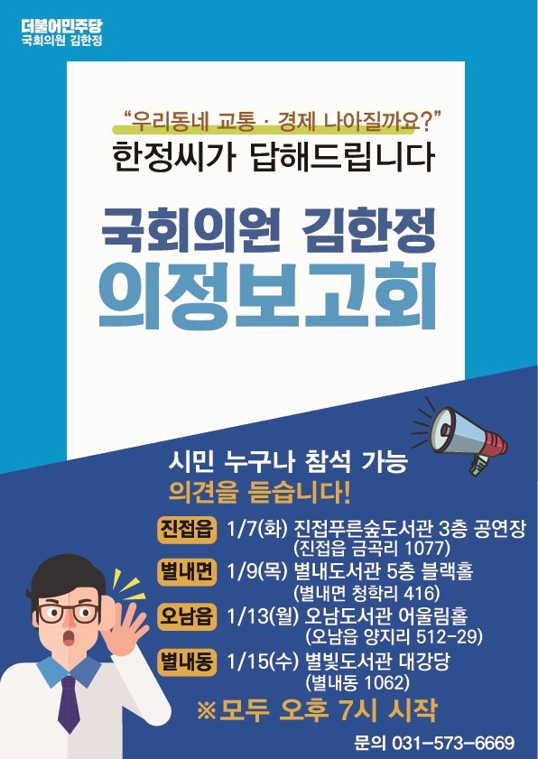 김한정 국회의원(더불어민주당, 경기 남양주을)이 7일 진접읍을 시작으로 ‘우리동네 교통·경제 나아질까요? 한정씨가 답해드립니다’ 의정보고회를 개최한다.