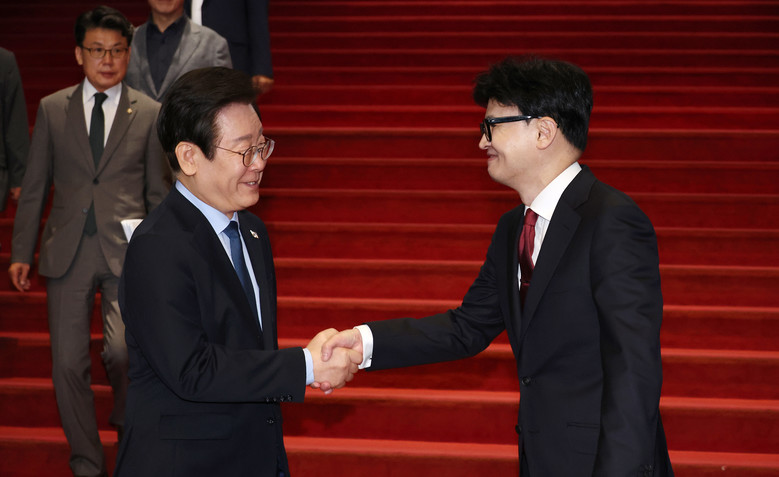 국민의힘 한동훈 대표와 더불어민주당 이재명 대표(왼쪽)가 1일 오후 국회에서 채상병 특검법, 금융투자소득세 폐지, 전 국민 25만원 지원법 등을 논의하는 여야 대표 회담을 마친 뒤 인사하고 있다. 2024.9.1