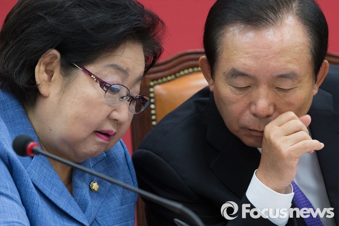| △ 이인제(오른쪽), 김을동 새누리당 최고위원이 21일 오전 서울 여의도 국회에서 열린 최고중진연석회의에 참석해 대화하고 있다. <사진제공=포커스뉴스> |