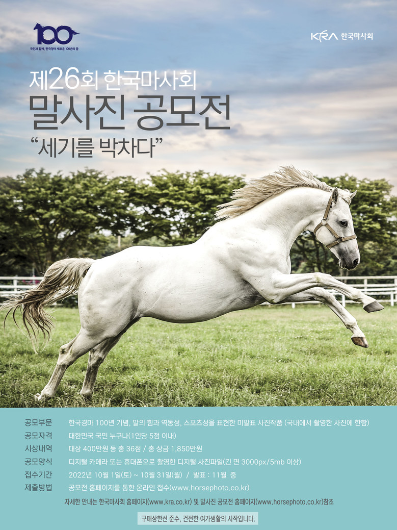 [세계타임즈 = 심하린 기자] 한국마사회(회장 정기환)가 제26회 말사진 공모전 ‘세기를 박차다’를 개최한다. 이번 사진 공모전은 올해로 한국경마 100년을 맞이한 한국마사회의 대국민 참여 이벤트다. 공모 대상은 말을 소재로 국내에서 촬영한 디지털 사진작품이다. 수상은 대상(상금 400만원)을 포함해 총 36점, 총상금 1,850만원 규모로 시행된다. 디지털카메라로 촬영한 사진 뿐 만 아니라 스마트폰으로 촬영한 사진도 입선을 통해 10작품을 선정할 계획이다. 접수는 10월 한 달간 진행되며 말사진 공모전 홈페이지를 통해 가능하다.