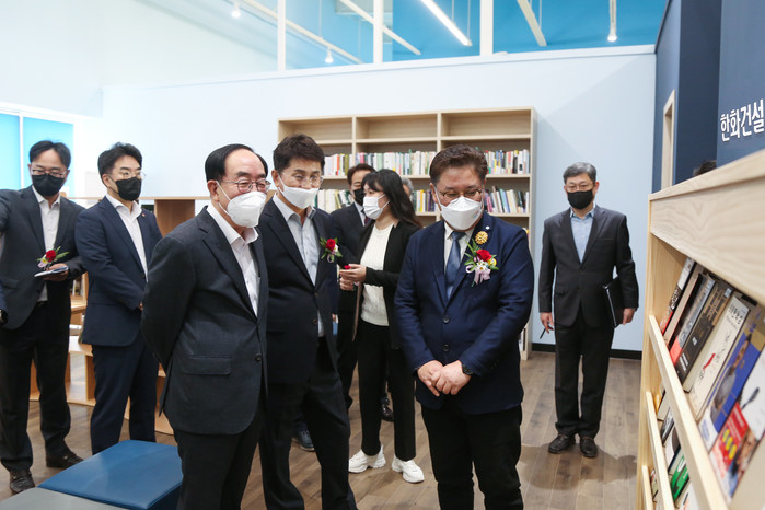 이번 포레나 도서관 100호점 개관식에는 최광호 한화건설 부회장을 비롯해 김정식 미추홀구청장, 허곤 서울시장애인복지시설협회장, 전창수 한화건설 인사지원실장 등 50여명이 참석했으며 경과보고 및 영상 시청, 도서관 제막식 등이 진행됐다.