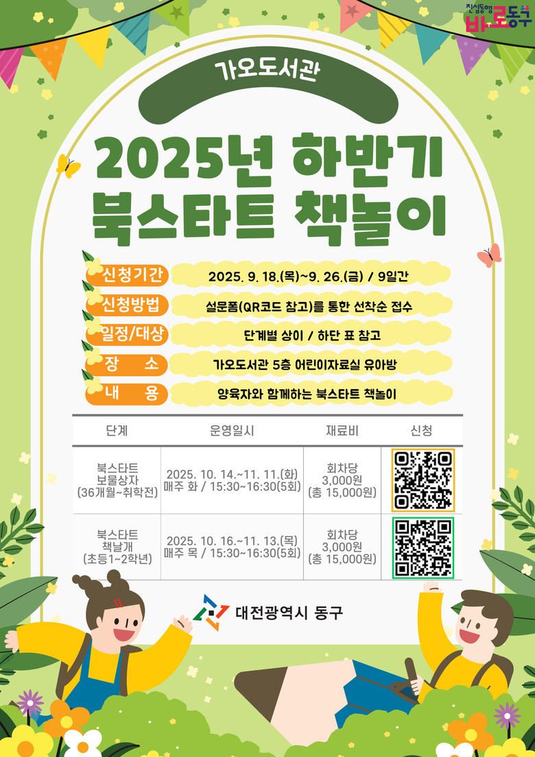 한편, 프로그램 관련 기타 자세한 사항은 동구 공공도서관 누리집 공지사항을 참조하거나 가오도서관(☎042-259-7059)으로 문의하면 된다.