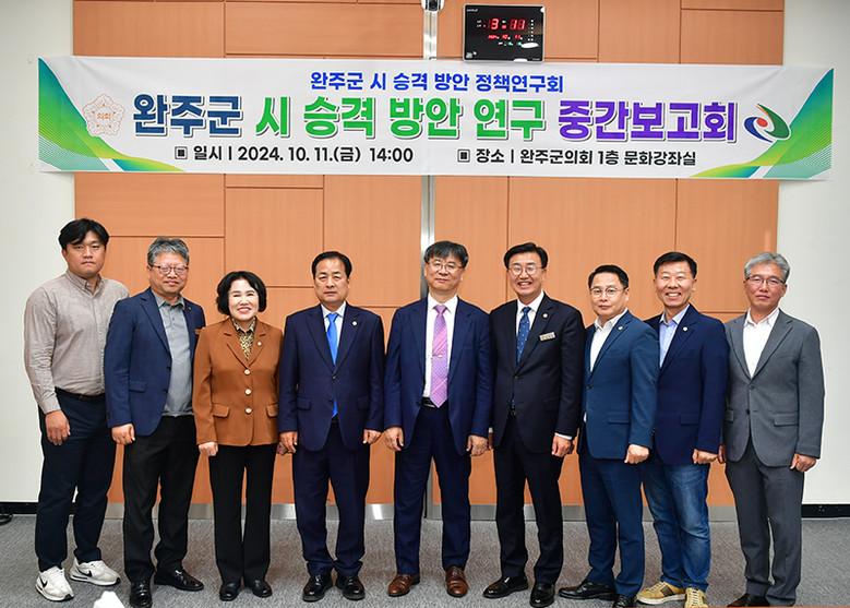 [완주군의회=세계타임즈 이상호 기자] 완주군의회 완주시(市) 승격 연구회(대표의원 서남용)가 지난 11일 연구용역 중간 보고회를 갖고, 연구방향에 대한 제시에 나섰다.