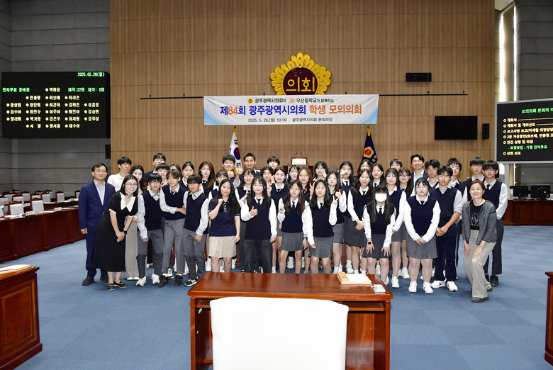 - 동아여자중학교, 학생자치 활성화를 위한 실천 조례안 제정 [광주 세계타임즈=손권일 기자] 광주광역시의회(의장 신수정)는 26일, 27일 이틀간 시의회 본회의장에서 우산중학교와 동아여자중학교 학생들을 대상으로 ‘광주광역시의회 학생 모의의회’를 개최했다.
