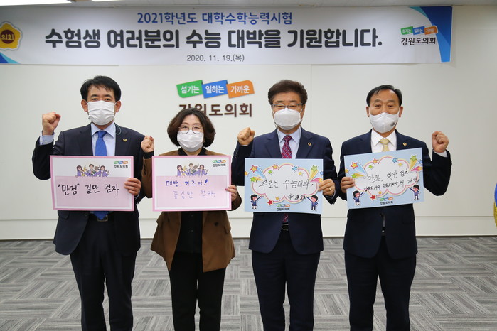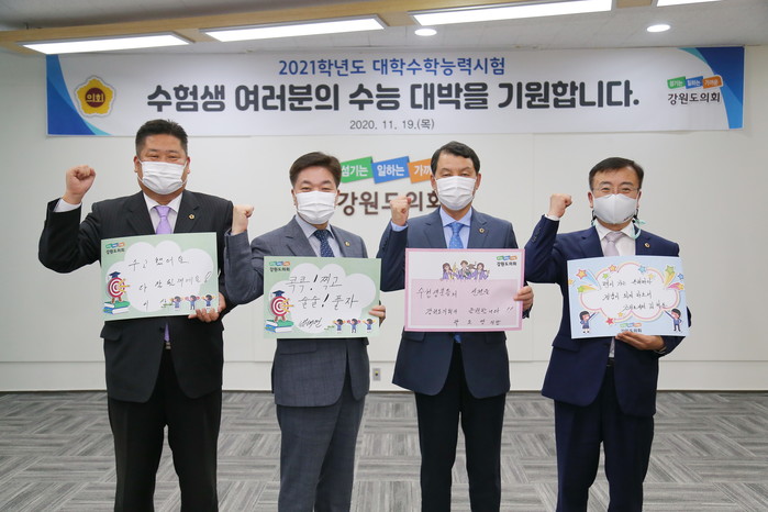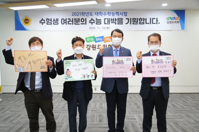 도의원들은 그동안 최선을 다한 수험생들이 대학수학능력시험을 잘 보길 기원하면서 “수능 잘 보고 꽃길만 걷자”, “풀어도 정답! 찍어도 정답”, “수험생분들의 선전을 강원도의회가 응원합니다!”등 다양한 응원메시지를 작성하였다.