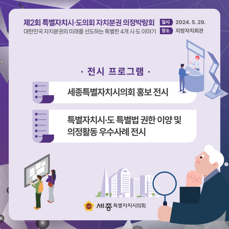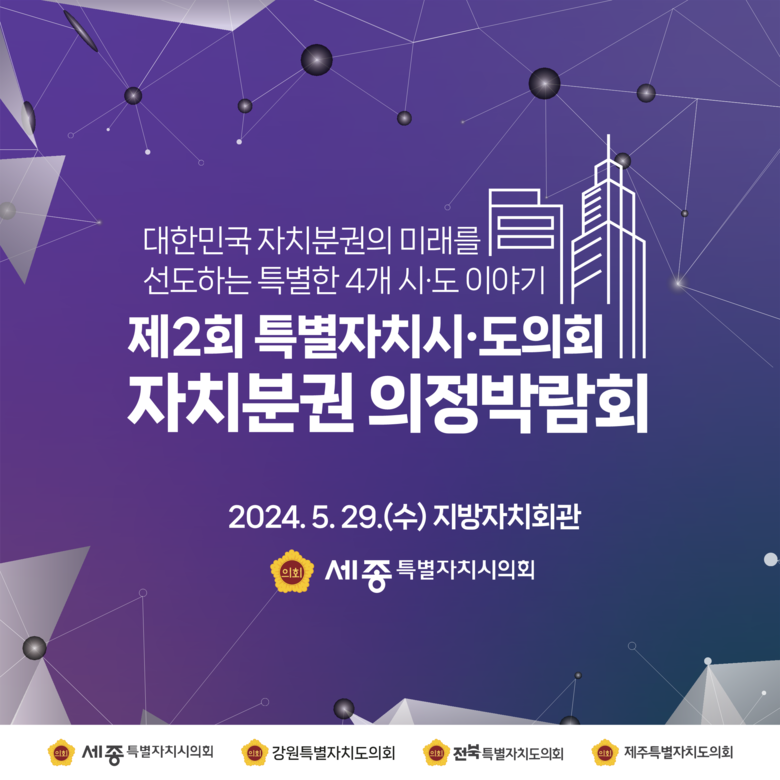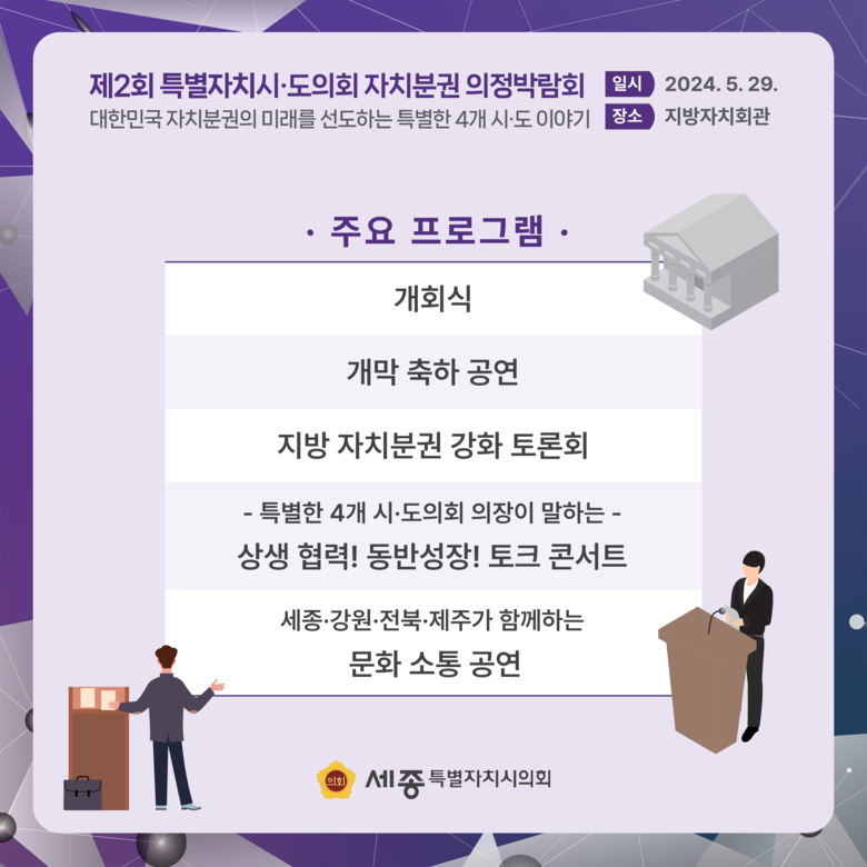 제2회 특별자치시‧도의회 자치분권 의정박람회는 세종시의회 주관으로 열리며 토론회와 토크 콘서트, 전시 및 홍보 부스, 지역별 문화 공연 등 다채로운 프로그램으로 구성돼 있다.