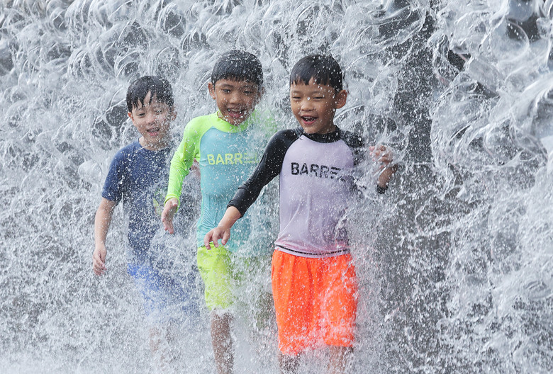 폭염이 이어지고 있는 4일 오후 경기도 수원시 영통구 광교호수공원 신비한 물너미에서 어린이들이 시원하게 쏟아지는 물을 맞으며 더위를 식히고 있다.