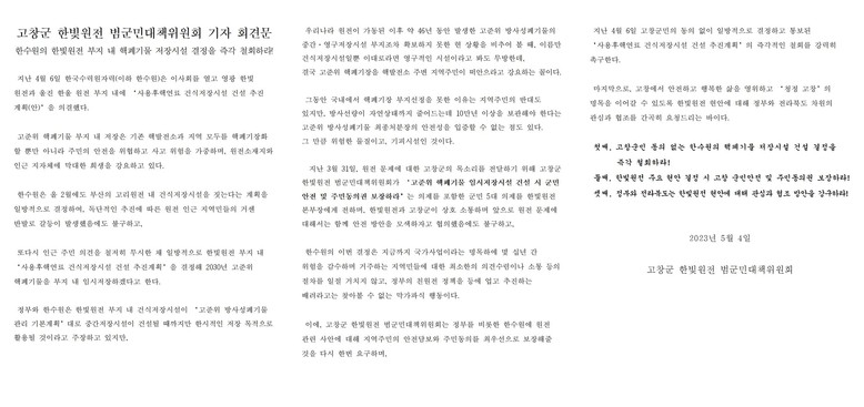 조규철 위원장(고창군의원)은“이번 한수원 결정은 지금까지 국가사업이라는 명목하에 수 십년 간 위험을 감수하며 거주하는 지역민들에게 최소한의 의견수렴이나 소통 등의 절차를 거치지 않았다.”며 “정부의 친원전 정책을 등에 업고 고창군민의 의견을 무시한 채 독단적으로 결정한 이번 계획에 대해 즉각적인 철회를 강력히 촉구한다.”고 성토했다.