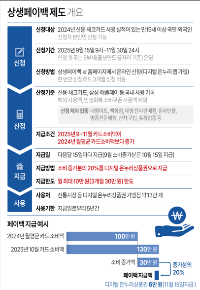 환급은 취약 상권 소상공인 지원 차원에서 전통시장과 상점가 등에서 사용할 수 있는 디지털 온누리상품권으로 이뤄진다.상품권은 약 13만개 디지털 온누리상품권 가맹점에서 받은 날로부터 5년간 쓸 수 있다.상생페이백의 산정 기준은 신용·체크카드, 삼성·애플페이 등의 국내 사용 기록이다.환급은 10월 15일부터 순차적으로 이뤄지며 오는 10∼11월 환급분은 그 다음 달 15일에 각각 지급될 예정이다.