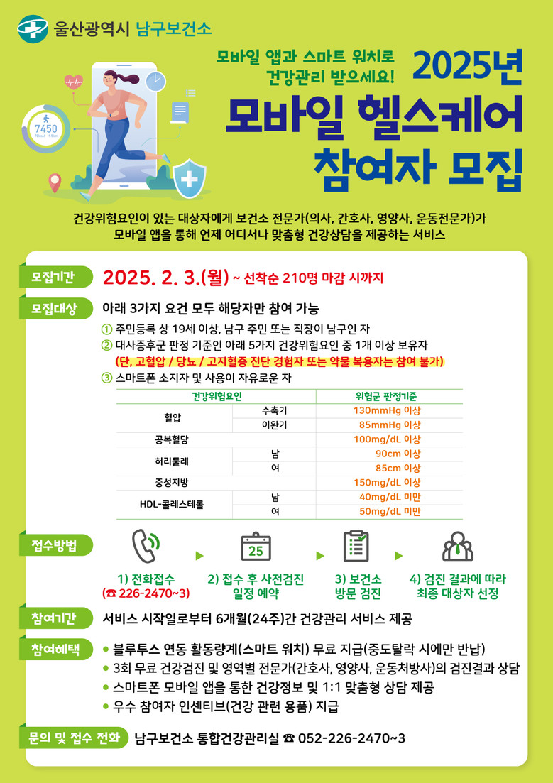 모집 대상은 19세 이상 남구 주민 또는 남구 소재 직장인 중 5가지 건강위험요인(혈압, 공복혈당, 허리둘레, 중성지방, HDL-콜레스테롤) 1개 이상 위험군으로 판정된 사람이다.