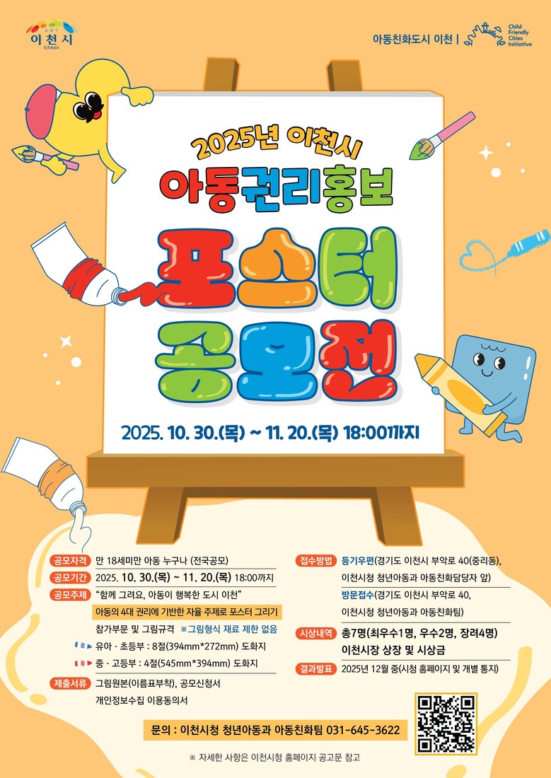 이번 공모전은 지난해 12월 유니세프 아동친화도시로 인증받은 이천시가 아동권리 실현과 존중 문화를 확산하기 위해 마련한 것이다. 선정된 포스터는 향후 아동권리 홍보사업 및 각종 아동 관련 정책에 다양하게 활용될 예정이다.