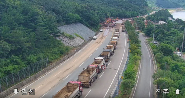 국도3호선 유출토사 제거를 위해 백호 7대, 덤프 20대, 로더 1대 등의 대규모 장비투입으로 신속히 응급복구를 마무리하여 이틀만에 4차로 도로구간중 편도 1차로 개통을 할 수 있었다.