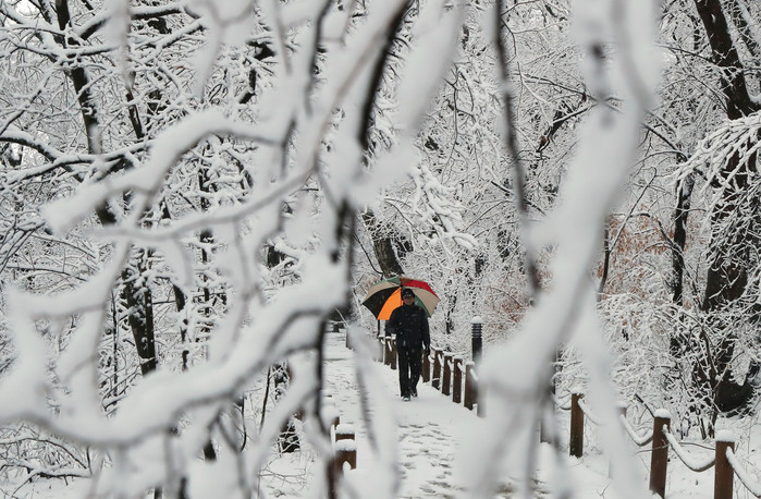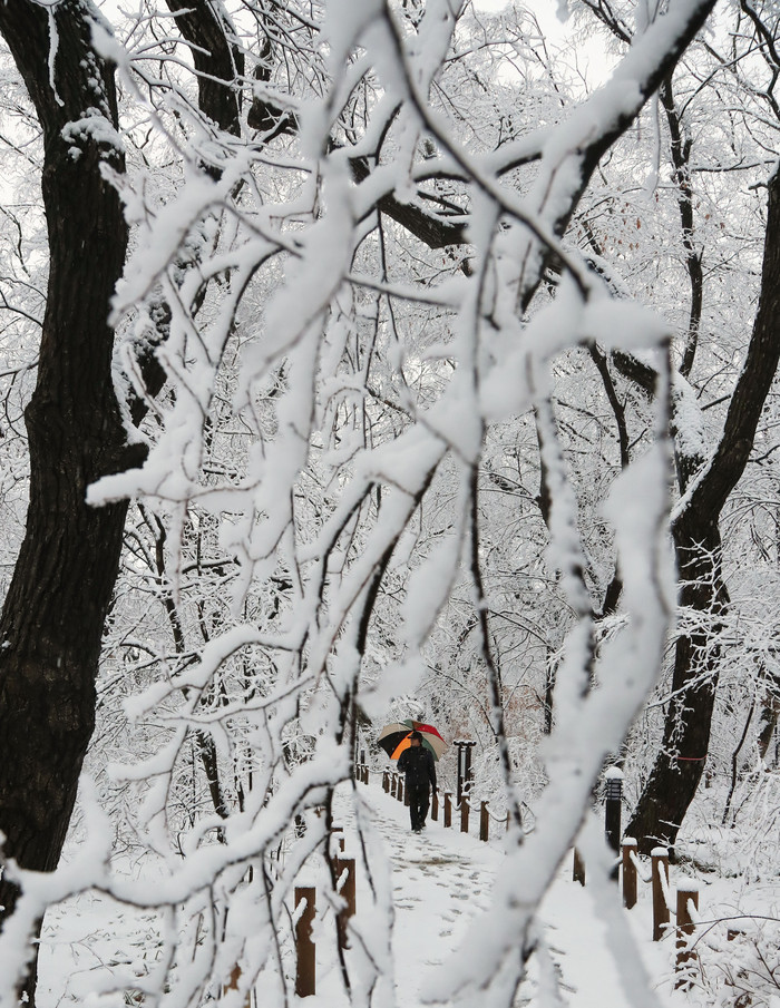 대설주의보가 내려진 8일 경남 함양군 천년의 숲 상림공원 나뭇가지가 하얀 눈으로 쌓여 아름다움을 연출하고 있다.