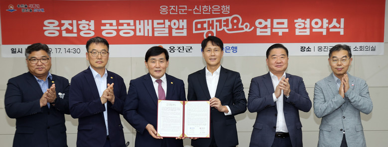 [옹진군 세계타임즈=심하린 기자] 옹진군(군수 문경복)은 17일, 군청 소회실에서 신한은행과 ‘옹진형 공공배달앱 운영을 위한 업무협약’을 체결하고, 공공배달앱 ‘땡겨요’도입을 공식화했다고 밝혔다.