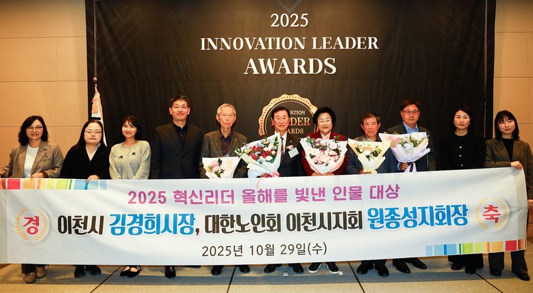 [이천시 세계타임즈=송민수 기자] 이천시(시장 김경희)는 지난 10월 29일(수), 대한뉴스신문(주) 주관으로 열린 ‘2025 혁신 리더 올해를 빛낸 인물 대상’ 시상식에서 김경희 시장은 ‘행정발전공헌 부문 대상’을, 대한노인회 이천시지회 원종성지회장은 ‘우수 시니어 지도자 노인복지 및 지역사회공헌 부문 대상’을 수상했다고 밝혔다.