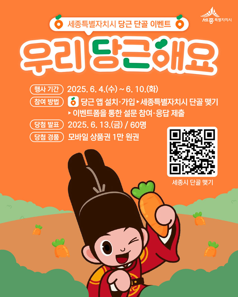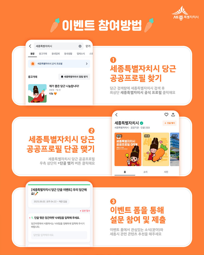 이벤트 참여는 ‘세종특별자치시’ 공공프로필과 단골을 맺은 뒤 당근 닉네임과 사회관계망서비스에 알리고 싶은 세종시 콘텐츠를 네이버폼으로 제출하면 된다.