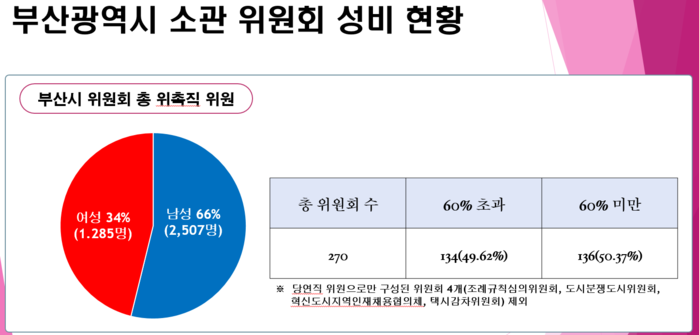 윤 의원이 조사한 바에 따르면, 부산시는 현재, 총 274개 위원회 중 총 3,792명의 위촉직 위원이 있으며, 이중 여성 위촉직 위원은 1,285명으로 34%를 차지하고 있다. 이에 윤의원은 총 위촉직 위원 성비는 법이 정한 기준에 크게 뒤떨어지지 않는 것처럼 보이지만, 각 위원회의 구성 및 분야별 성비를 분석해보면 부산시 위원회의 성비불균형이 심각하다고 지적하였다.