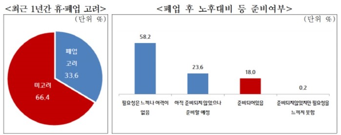 지난 5월 중소기업중앙회가 도소매, 음식숙박, 개인서비스업종 소상공인 500개사를 대상으로 소상공인 경영실태 및 정책과제 조사 내용을 보면 조사대상 업체 중 33.6% 업체가 최근 1년 내 사업전환이나 휴·폐업을 심각하게 고려하고 있는 것으로 조사되었습니다.