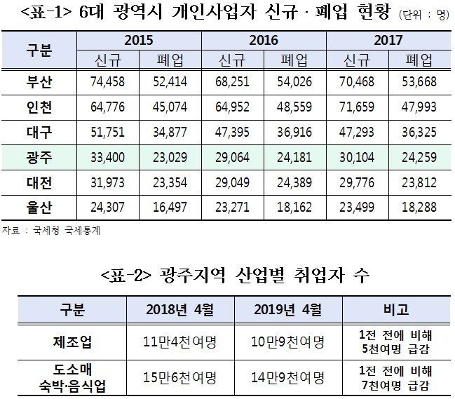 2017년 우리시 자영업자 2만 4천여명이 폐업하여 전국광역지자체 중 전년 대비 최고 수준을 기록하였으며, 도소매 숙박·음식업 취업자는 2019년 4월 현재 1년 전에 비해 7천여명이 줄었습니다.