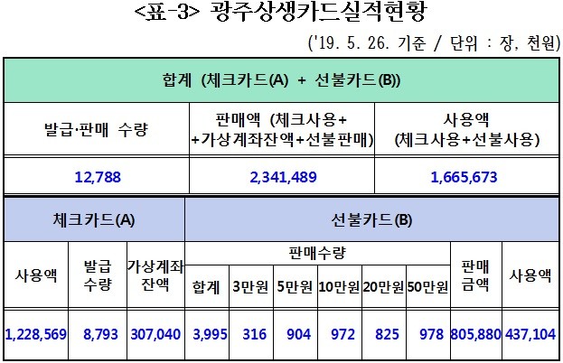 5월 26일 현재 광주상생카드 12,788장을 발급 및 판매, 판매액은 23억4천1백여만원, 사용액은 16억6천5백여만원 입니다.