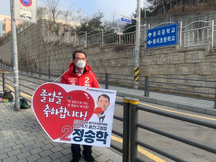 ▲정송학 예비후보가 피켓을 들고 졸업축하 인사를 하고 있어 이채롭다. |