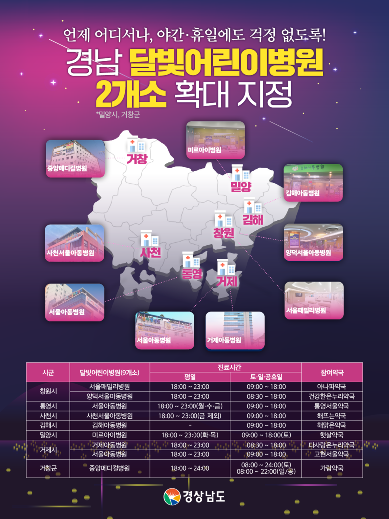 이번 신규 지정된 달빛어린이병원은 밀양시 소재 미르아이병원과 거창군 소재 중앙메디컬병원으로 인근 응급의료기관 및 약국과 협약을 체결하고 소아환자 연계 협력체계를 구축하였으며, 7월 1일부터 운영을 시작하였다.