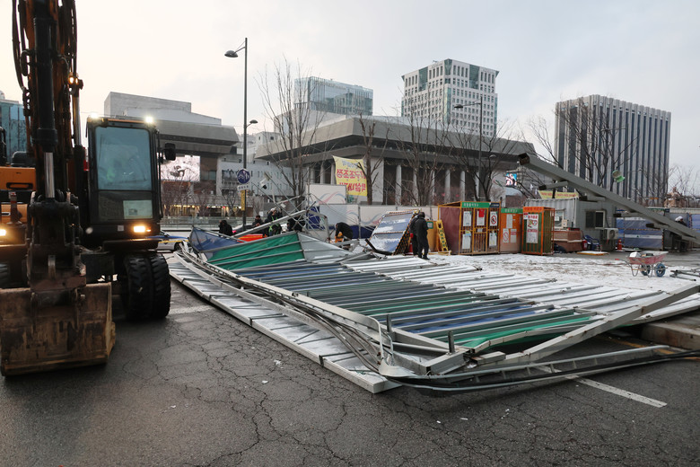 강풍에 쓰러진 공사장 펜스