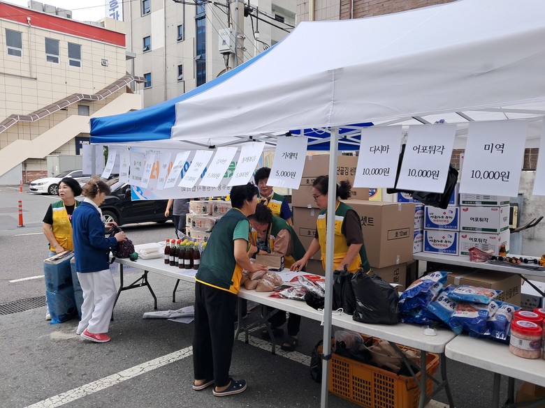 이번 바자회는 주변에 어려운 이웃을 돕기 위한 기금 마련을 위해 진행되었으며, 미역·김·다시마·들기름·참기름 등을 저렴하게 판매해 주민들의 호응을 얻었다.