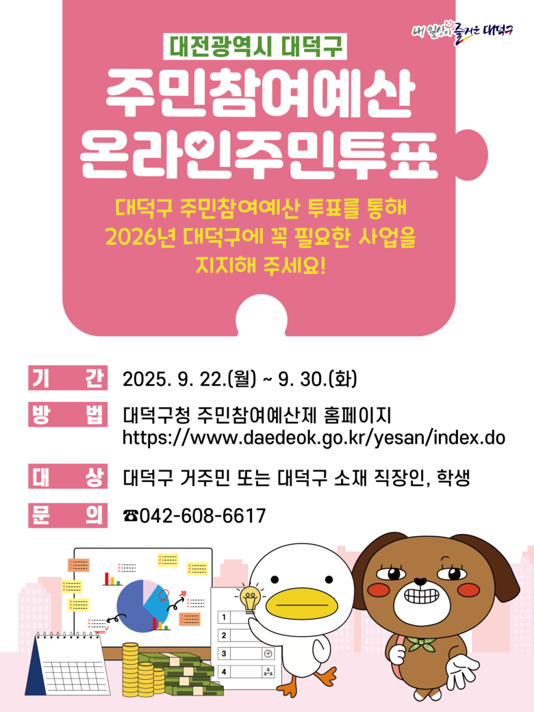 홈페이지 로그인·본인인증 후 최대 3개 선택… 고득점 순서로 내년도 예산 반영 [대덕구 세계타임즈=이채봉 기자] 대전 대덕구(구청장 최충규)는 오는 22~30일 2026년 주민참여예산 사업 선정을 위한 온라인 주민투표를 진행한다고 16일 밝혔다.