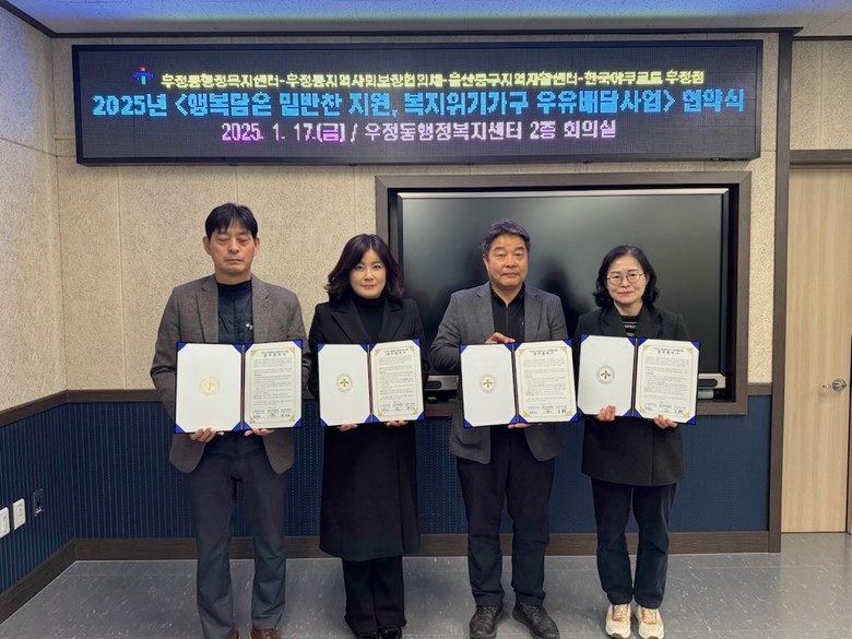 [중구 세계타임즈=이호근 기자] 울산 중구 우정동 행정복지센터(동장 김다인)와 우정동 지역사회보장협의체(위원장 이채영), 울산중구지역자활센터(센터장 배정희), 한국야쿠르트 우정점(점장 김철환)이 17일 오후 3시 우정동 행정복지센터 회의실에서 ‘행복담은 밑반찬 지원 사업’ 및 ‘복지위기가구 우유배달 지원 사업’ 추진을 위한 업무협약을 맺었다.