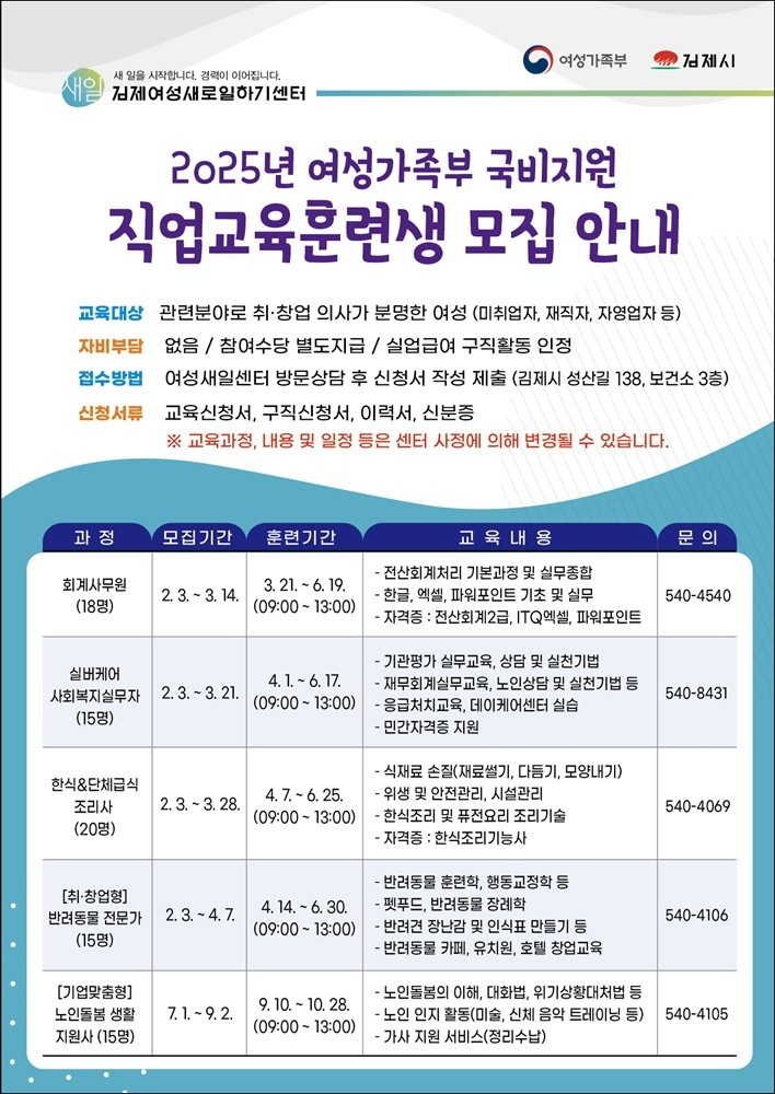 교육은 오는 3월 21일부터 실시하는 회계사무원 양성과정을 시작으로 4월 1일 실버 케어 사회복지 실무자 양성과정, 4월 7일 한식&단체급식 조리사 양성과정, 4월 14일 반려동물 전문가 양성과정, 9월 10일 노인 돌봄 생활지원사 양성과정을 순차적으로 교육 운영할 계획이며, 각 과정별로 15~20명의 훈련생을 모집한다.