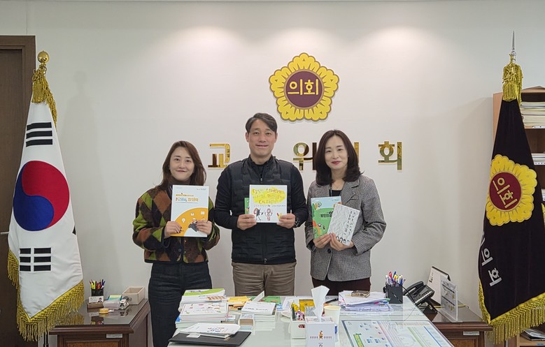 이날 간담회에서는 이용창 교육위원장은 학생들의 습관 형성을 위한 ‘루틴 챌린지’ 포도알 스티커, 교사들을 위한 수업과정 구성 책자, 아이들이 직접 읽걷쓰 프로그램에 참여하여 만든 그림책, 사업 팜플렛 등 교육 현장에서 실제로 사용되는 다양한 읽걷쓰 자료를 직접 살펴보았다.