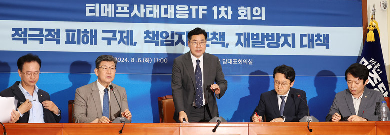 [세계타임즈 = 심귀영 기자] 더불어민주당은 티몬과 위메프(티메프)의 대규모 판매대금 정산 지연 사태와 관련해 당내 태스크포스(TF)를 설치했다.민주당은 국회에서 열린 TF 첫 회의에서 정부의 대응을 질타하며 적극적인 대책 마련을 촉구했다.박찬대 원내대표는 사태의 가장 큰 책임은 윤석열 정부의 무능함에 있다며 허술한 관리·감독과 안일한 대처가 참사를 불렀다는 비판을 피하지 못할 것이라고 비판했다.박 원내대표는 정부는 자율 규제 입장만 고수하면서 거대 플랫폼 시장에 발생한 문제점을 외면했다며 금융당국이 사실상 시한폭탄을 그대로 방치한 것이라고 강조했다.정부가 피해 대책으로 내놓은 대출 지원 방안과 관련해선 빚내서 빚을 돌려막으라는 것밖에 안 된다고 지적하면서 철저한 원인 규명과 온라인 플랫폼법 제정을 비롯해 피해구제 대책 마련에 나설 것이라고 덧붙였다.TF 단장인 국회 정무위원회 소속 천준호 의원은 기업인의 탐욕과 방만 운영, 윤석열 정부의 허술한 감독이 사태의 원인이라며 '윤석열 대통령은 이복현 금감원장을 해임하고 한기정 공정거래위원장을 문책하라고 했다.