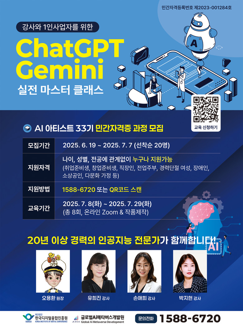 [세계타임즈]최성룡기자 = AI 기술의 급속한 발전과 함께 개인과 기업 모두에게 AI 역량은 선택이 아닌 필수가 되고 있다. 이러한 흐름에 발맞춰 (재)한국디지털융합진흥원 부설 글로벌AI메타버스개발원(원장 오용환)은 ‘AI 아티스트 33기 ChatGPT-Gemini 실전 마스터 클래스’ 민간자격증 과정을 개설하고, 수강생을 모집 중이다.