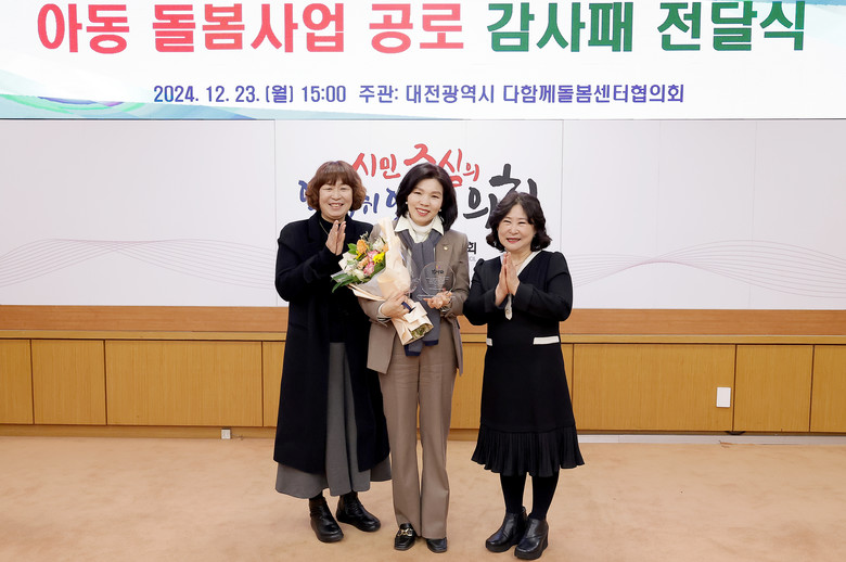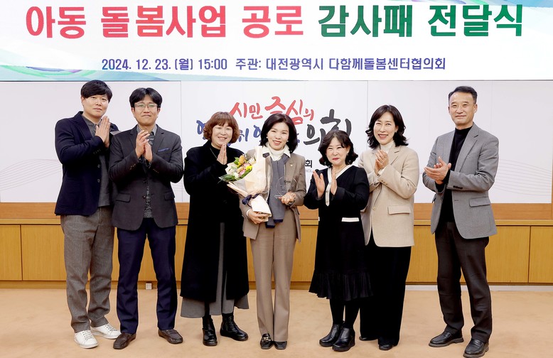 [대전 세계타임즈=이채봉 기자] 대전광역시의회 이금선 교육위원장(국민의힘, 유성구4)이 아동돌봄사업 발전에 기여한 공로로 대전광역시 다함께돌봄센터협의회 회원들로부터 감사패를 받았다.