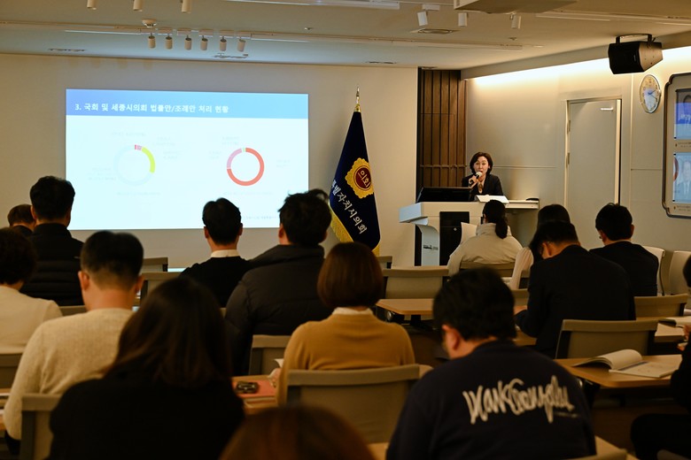 [세종 세계타임즈=이채봉 기자] 세종특별자치시의회(의장 임채성)는 23일 의회사무처 직원을 대상으로 2024년 4분기 사례별 자체법제교육을 실시했다.
