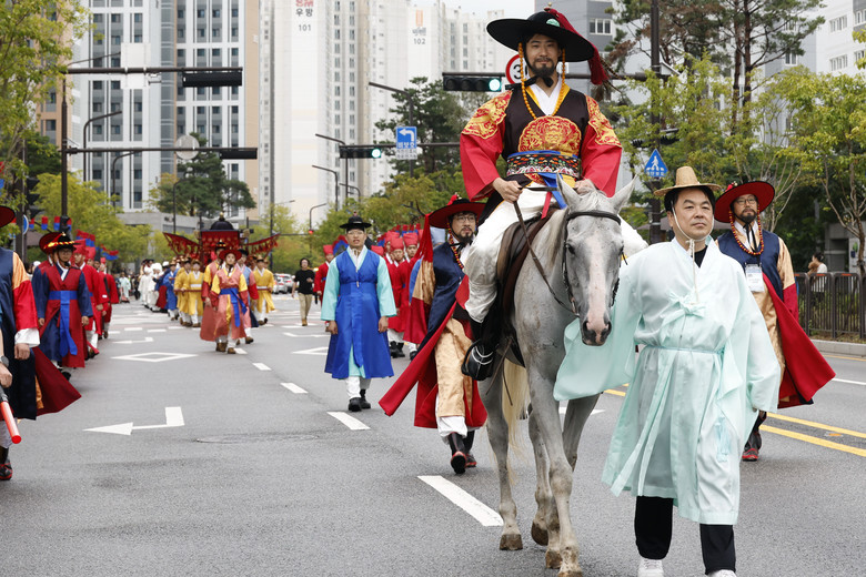 둘째 날인 28일에는 우천으로 인해 일부 구간(현대구간, 동탄 센트럴파크~현충공원)이 축소됐지만, ‘정조대왕 능행차’는 ▲전통구간(황계동~현충공원) ▲미래구간(현충공원~융릉)으로 나뉘어 시민들의 참여 속에 진행됐다.