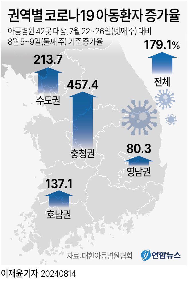 [세계타임즈 = 박서원 기자] 코로나19가 재유행하는 가운데 아동환자 수가 최근 2주일 새 2.8배 가까이로 급증한 것으로 나타났다.대한아동병원협회에 따르면 협회 회원 병원 중 42곳의 코로나19 아동환자는 7월 22∼26일 387명에서 8월 5∼9일 1천80명으로 179.1% 늘었다. 7월 말에서 8월 초 사이 2주간 2.79배로 증가한 것이다.권역별로는 충청권에서 코로나19 아동 환자가 54명에서 301명으로 무려 457.4% 폭증했다.서울·경기·인천 등 수도권에서는 213.7%, 호남권에서는 137.1%, 영남권에서는 80.3% 증가했다.최용재 대한아동병원협회 회장은 코로나19 아동 환자는 대부분 무증상 혹은 경증 환자들이라 더 쉽게 확산할 수 있다며 특히 심장병이나 당뇨 환자들은 고위험군이어서 확진되면 반드시 병원을 찾아 추가 검사나 관리를 받아야 한다고 강조했다.보건당국은 방학과 휴가철이 끝나는 이달 하순에 코로나19 확산이 절정에 이를 수 있을 것으로 내다봤다.호흡기 바이러스는 주로 겨울철에 유행하지만, 코로나19는 여름철에도 유행해왔다.질병관리청에 따르면 올해 코로나19 입원환자 수는 2월 이후 계속 줄다가 오미크론 신규 변이 바이러스 KP.3의 출현 등에 따라 다시 늘고 있다.홍정익 질병청 감염병정책국장은 방학·휴가가 끝나고 사람들이 다시 모이는 행동 변화가 일어나면 감염병 유행에 영향을 미칠 수 있다며 냉방으로 인한 밀폐된 공간이 많이 생기는 것도 여름철 유행의 큰 이유라고 설명했다.질병청은 의료 현장 차질 여부와 환자 발생 추이를 관찰하는 한편 기존에 운영하던 코로나 대책반을 확대 운영해 유행을 통제할 방침이다.코로나19 치료제 사용량이 빠르게 증가함에 따라 이달 안에 치료제도 추가 구매한다.오는 10월부터는 예정대로 2024∼2025절기 백신 접종을 실시한다. 65세 이상 고위험군 위주로 무료 접종이 이뤄지며, 일반 국민은 희망하면 유료 접종할 수 있다.이달 셋째주와 넷째주 상당수 학교가 개학하는 가운데 교육당국은 복지부·질병청과 함께 상황을 주시하고 있지만 아직까지 긴급한 조치를 취할만한 상황은 아닌 것으로 보고 있다.기존의 코로나19 출결·평가·기록 가이드라인이 폐지되고 확진 학생의 출석인정결석 지침도 없어졌기 때문에 학교에서는 코로나19로 인한 결석도 독감 등 다른 감염병처럼 의료진 소견에 따라 출석인정 여부를 결정한다.교육부 관계자는 코로나19는 현재 인플루엔자에 준해 대응하고 있는데 학교도 나름의 매뉴얼을 숙지하고 있다라며 개학했을 때 학교가 어떤식으로 해야하는지, 개인 방역수칙 준수 등의 내용을 학교에 한번 더 안내할 예정이지만 추가 조치를 계획하고 있지는 않다라고 말했다.확진자 격리 의무가 없어졌고, 상태가 호전된 뒤 24시간 이후 학교에 가는 것을 '권고'하고 있기 때문에 (학생이 확진됐다면) 여기에 따라 조치하면 된다라며 다만, 확진됐는데 증상이 없어 등교할 경우 마스크 착용 등 개인 방역수칙을 준수해야 한다라고 덧붙였다.