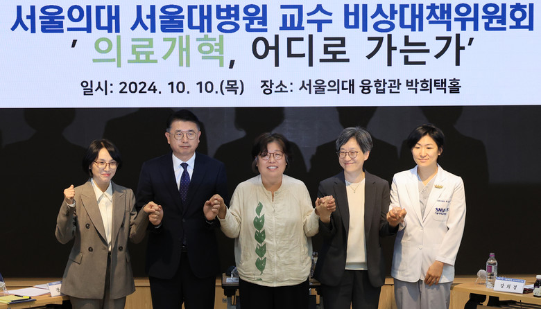 | ▲장상윤 대통령실 사회수석비서관(왼쪽 두번째), 정경실 보건복지부 의료개혁추진단장(왼쪽), 강희경 서울의대·병원 교수 비대위원장(오른쪽 두번째), 하은진 서울의대·병원 교수 비대위원(오른쪽)이 10일 오후 서울 종로구 서울대 의대 융합관 박희택홀에서 열린 '의료개혁, 어디로 가는가' 토론회에 참석해 기념 촬영하고 있다. 2024.10.10 |