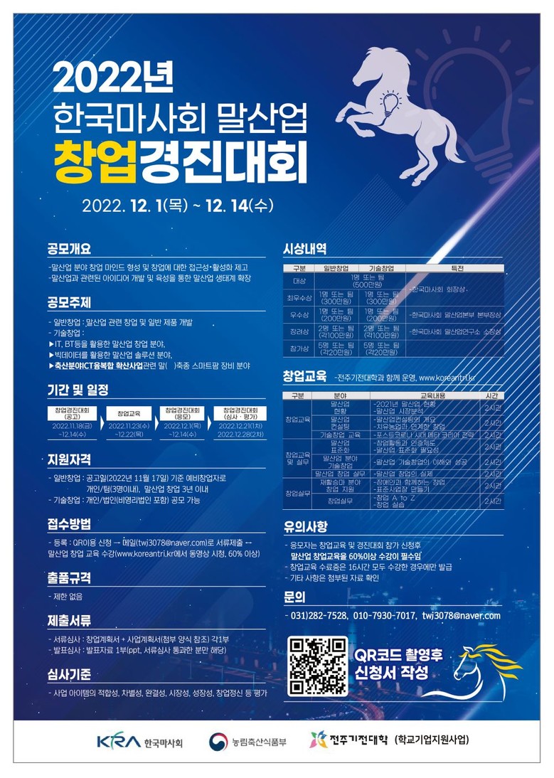 금번 경진대회에 참가를 희망하는 이들은 11월 23일부터 전주기전대학과 공동으로 실시하는 온라인 창업교육의 60%이상을 수강해야 경진대회 참여 자격을 얻을 수 있다. 온라인 교육에는 말산업에 대한 내용과 함께 ’포스트 코로나 시대 메타 코리아 전략‘, ’말산업 기술창업의 이해와 성공‘ 등 기술창업분야 교육 내용도 포함되어 있다.