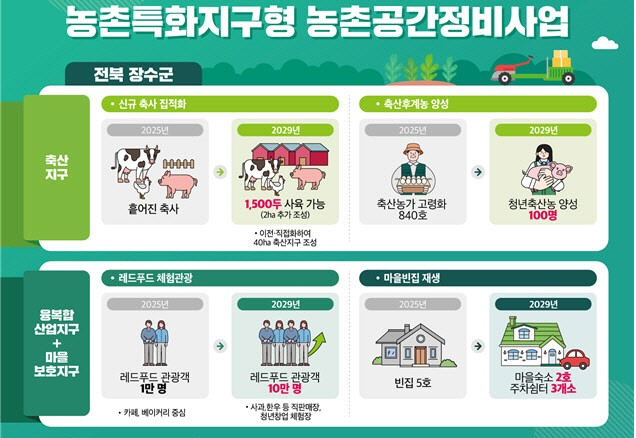 장수군은 오는 2029년까지 계남면 일원에 국비 50억 원, 도비 15억 원, 군비 35 억 원 등 총사업비 100억 원을 투입해 △ 장수한우(레드푸드) 축산지구, 레드푸드 융복합산업지구, 레드푸드 마을보호지구 등 세 구역은 연계 조성한다.