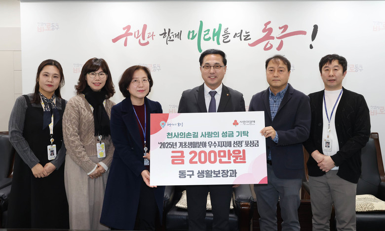 [동구 세계타임즈=이채봉 기자] 대전 동구(구청장 박희조)는 ‘기초생활보장 분야 사업 평가’에서 우수지자체로 선정돼 받은 기관 포상금 200만 원을 동구 대표 복지브랜드인 ‘천사의 손길’에 기탁했다고 밝혔다.